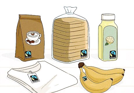 Buy fair trade. Fair trade certified products are guaranteed to have been produced under humane conditions for workers. Buying something with a “fair trade” label ensures that workers creating the product have been paid a fair wage and that they worked under sustainable conditions. Fair trade items will almost always be labeled as such. If you're unsure if something is fair trade, try to at least avoid items that are often unethically sourced. Coffee, bananas, cocoa, many tropical fruits, wine (mainly from California), clothing items (mainly from China, Bangladesh, and SE Asia) and jewelry are often unethically sourced. By buying these products as much as possible, you can show companies that you think these practices are worth a few extra pennies and encourage other companies to invest in these practices as well.