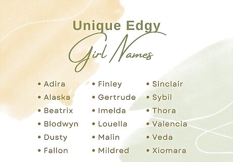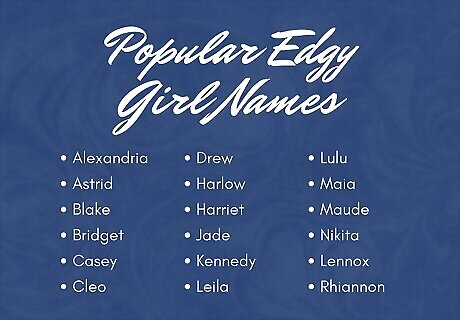 Go with a well-loved edgy name if you want a sure thing. If you’re looking for an edgy name for your little girl but you don’t want something too outside-the-box, these names are perfect for you! They all have an edgy, cool vibe, but they’re well-known and have withstood the test of time. Alexandria: “Helper” or “defender,” Greek origin. Alix: “Noble,” German origin. Astrid: “Divinely beautiful” or “beloved of the gods,” Norse origin. Avril: “Month of April,” French origin. Blake: “Dark,” “black,” “white,” or “pale,” British origin. Bridget: “Strength,” “power,” or “exalted one.” Casey: “Brave” or “watchful,” Irish origin. Cassandra: “Man’s defender” or “warrior,” Greek origin. Cleo: “To celebrate” or “to make famous,” Greek origin. Drew: “Wise,” “courageous,” and “strong,” Welsh origin. Harlow: “Army,” English origin. Harriet: “Home ruler,” German and French origins. Jade: “Precious stone,” British origin. Kennedy: “Protected with helmet,” Gaelic origin. Leila: “Night,” Arabic origin. Lulu: “Famous battle,” German origin. Maia: “Brave warrior,” Maori origin. Matilda: “Mighty in battle,” German origin. Maude: “Battle-mighty,” German origin. Maxine: “Greatest,” Latin and Scottish origins. Meredith: “Protector of the sea,” Celtic origin. Millie: “Gentle strength,” German origin. Morgan: “Sea warrior,” Welsh, English, and French origin. Moxie: “Boldness and strength of character,” American origin. Nikita: “Unconquered,” Greek origin. Lennox: “With many elm trees,” Scottish and Celtic origins. Rhiannon: “Great queen” or “goddess,” Welsh origin. Riley: “Courageous” or “valiant,” British and Irish origins. Roxanne: “Bright,” “shining,” and “radiant,” French, Persian, and Greek origins. Roxie: “Dawn,” “bright,” or “window of light,” Persian and Greek origins. Scarlett: “Red,” French and English origins. Scout: “To listen” or “sent to discover,” French origin. Skye: “Island of clouds” or “winged,” Scottish origin. Valerie: “Strong” and “brave,” French origin. Zelda: “Gray fighting maid,” English and Spanish origins.