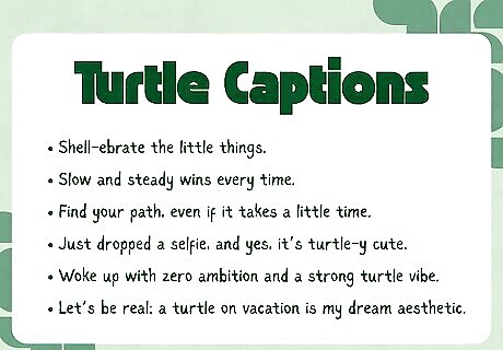 Social media expert Kasey Dunn says your caption should be concise enough to “captivate the audience in the first eight seconds” of seeing your post. After a few lines of text, Instagram hides the rest of your caption, so when in doubt, keep it simple. Here are some short, turtle-inspired captions: Shell-ebrate the little things. Slow and steady wins every time. Find your path, even if it takes a little time. Just dropped a selfie, and yes, it’s turtle-y cute. Woke up with zero ambition and a strong turtle vibe. Let’s be real: a turtle on vacation is my dream aesthetic. My spirit today: turtle in a hammock with zero responsibilities. Turtle pretending to be a rock until all responsibilities disappear. Currently embracing turtle energy: chill, slow, and snack-focused.