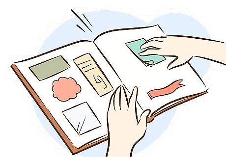 Make a scrapbook. If you have boxes full of photographs, ticket stubs, restaurant menus, and other random knick-knacks, take some time to make a scrapbook. Buy a blank scrapbook from an art store or a drugstore. Lay out the items you want to save by date and category. Arrange the items artfully and then paste them into the scrapbook. Consider adding witty or sentimental captions.