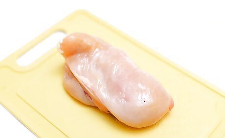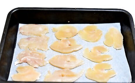Bake the jerky. Lay the chicken breast on its side and slice it into 1/8 inch strips. Lay the strips on a baking sheet, preheat your oven to 200 degrees, and bake for 2 hours. The jerky should be tough and dry. Bake for another 20 minutes if it is still juicy and soft.
