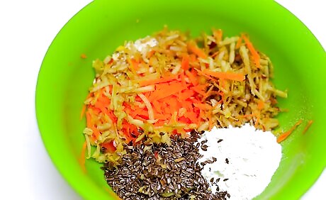 Gather the ingredients. Get 2 cups of organic carrots, a quarter cup of dry oats, 1 apple, 3/4 cups of organic wheat flour, and 1 cup of organic flax seed. Core and shred the apple while making sure that you remove all seeds. Mix the ingredients in a large mixing bowl with a quarter cup of water until you have a thick batter.