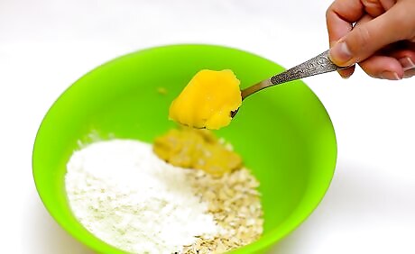 Mix the ingredients. Get a large mixing bowl. Add in 2 cups of flour, 1 cup of oats, 1/3 cup of peanut butter, and 1 tablespoon of honey. Mix them thoroughly with a spoon or whisk. Then add 1 and ½ cups of water to the mixture and mix it in until it becomes thick and doughy.