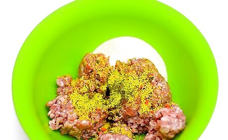 Gather the ingredients. Get raw organic beef, organic vegetable baby food for humans, flour, and dried milk. Mix 6 ounce balls of meat with an equal amount of baby food in a large mixing bowl. Add two cups of dry milk and mix it in thoroughly. Then add 1 cup of water to create a doughy consistency. You can also use diced leafy vegetables like cabbage or spinach instead of baby food.