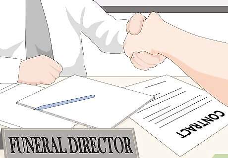 Choose the funeral director you want to oversee your burial. If your state requires a funeral director to oversee your home burial, you may want to set up a contract in advance so that you know that your burial desires will be fulfilled. Even if you don't ultimately sign a contract, a funeral director with experience in home burials can still give you a lot of information and help you determine what arrangements you need to make in advance. The National Home Funeral Alliance (NHFA) has a directory of funeral directors and other experts who conduct home funerals. Visit https://www.homefuneralalliance.org/directories.html#!directory to search the directory for local professionals who can help you plan your home burial. If you don't want to hire a funeral director in advance, let designated family members know that they'll need to hire someone to oversee the burial.