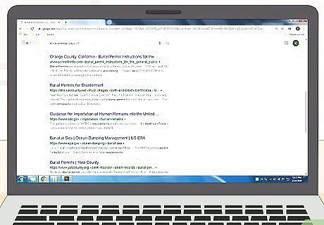 Find out which government agencies you need to work with. In many states, the department of health regulates burials. However, some states may have a separate board. The easiest way to find out which government agencies you would need to work with to coordinate a home burial is to call your city or county clerk's office. Search online for "county clerk" along with the name of your county and state to find the clerk's website. There will be contact information listed. When you call, ask which agency regulates funerals and burials in your county.