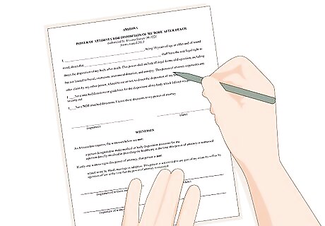 Document your decisions apart from your will or trust. If you have a will, chances are it won't go through probate until long after you've passed. That would be too late to communicate your burial preferences. Create a separate document and make sure designated family members have copies of it. The Funeral Consumers Alliance has forms you can use to document your final wishes available at https://funerals.org/?consumers=legal-right-make-decisions-funeral. Make sure you choose the right form for your state. If there's no form specific to your state, you can use the generic blank form.Tip: In most states, your family members are legally required to honor your decisions regarding your funeral as long as they aren't illegal or impractical.