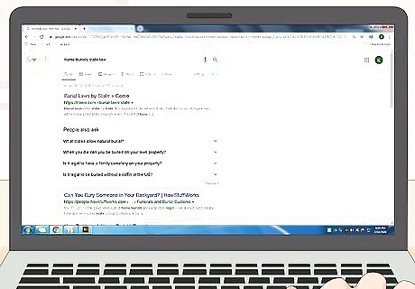 Determine the law in your state for home burials. In the US, home burials on private property are a matter of state or local law. Your state may fall into one of 3 broad categories: No home burials: A few states, including California, Indiana, and Washington, do not allow home burials on private property. Home burial with professional oversight: Some states require you to hire a funeral director to oversee the burial. These states include Alabama, Connecticut, Illinois, Michigan, New Jersey, and New York. No home burial laws: Many states have no specific state laws regarding home burial. There may still be local ordinances.Tip: Even if your state's law doesn't specifically address home burial, other state laws regarding burial generally, such as the depth of the grave or the location of the gravesite, would still apply.