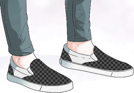 Keep your shoes flat. For an authentic emo look, forget about wearing any shoes with a high heel. Instead, wear flat shoes -- that can be any flat tennis shoes, boots, or slip-on shoes that you are comfortable in. However, the most common type of flat shoes in emo fashion are Converse or Vans style tennis shoes. You can’t go wrong with black shoes when you’re going for an emo look, but you can also go for a colored pair in shade such as red or purple. Patterned tennis shoes also work in emo fashion -- try a checkered or striped design.
