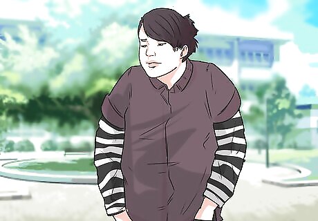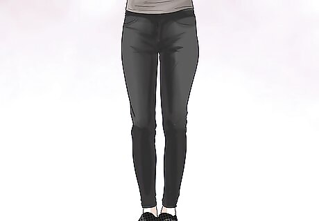 Opt for skinny jeans. Loose clothing is a big no-no in emo fashion, so sweatpants and baggy jeans aren’t the best option if you want to dress emo. Instead, both girls and guys should opt for skinny jeans that fit closely to the body. Girls can also go with slim-fitting skirts, and pair them with dark tights or leggings underneath. It’s best to choose black or dark denim skinny jeans to fit the emo look. Skinny jeans that feature rips, tears, or studs are perfect when you want to dress emo. If you aren’t comfortable in skinny jeans, you can swap them for straight leg jeans that are a little looser. Just be sure to avoid baggy jeans that you constantly need to pull up because they won’t fit the look at all.