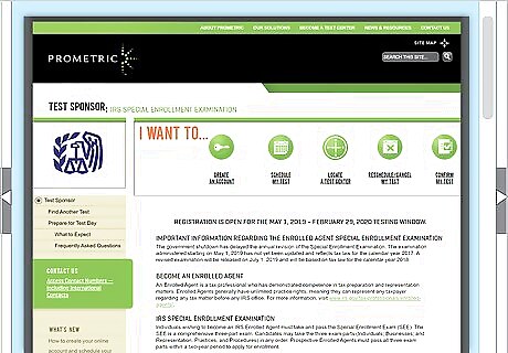 Apply to take the exam on the Prometric website. The SEE is administered on behalf of the IRS by Prometric. When you're ready to take the exam, go to https://www.prometric.com/en-us/clients/see/pages/landing.aspx and create an account. Once you've created an account with Prometric, you'll be able to schedule your test. Tests are conducted at a Prometric testing center. If you live in a rural area, you may have to travel to a testing center. Be sure to factor in travel time when you schedule your test. The fee for the SEE is $184.97 per part, or $554.91 total. The fees must be paid when you schedule your test. You can pay your fee with a major credit or debit card or an electronic check. Prometric also allows you to schedule a "dry run" to familiarize yourself with the examination experience before test day.