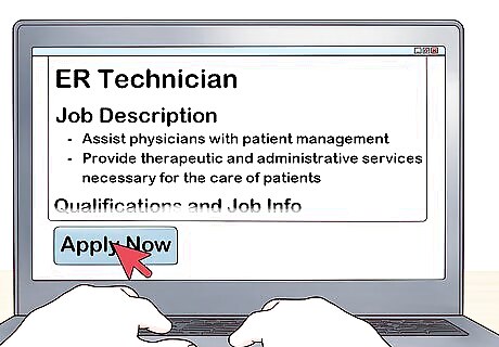 Apply for jobs as an ER technician. If you find a job on 1 of these job websites, you can upload your resumé and click "apply" to send your application. However, it's always better to mail your resumé and cover letter to the employer rather than use these sites. Mail applications will impress employers as they will recognize the effort you had to go through to apply.