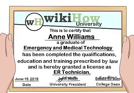 Take and pass the NREMT exam. To get certified and licensed to work as an ER technician, you will need to pass the exam held by the National Registry of Emergency Medical Technicians. Some states might require you to take another exam on top of the NREMT exam to get certified. The exam costs $70. Use the following website to sign up for the NREMT test: https://www.nremt.org/rwd/public/document/cognitive-schedule.