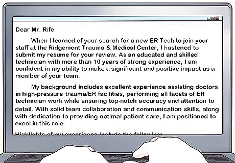 Include a cover letter with each application. A cover letter is a letter sent with your resumé that allows you to delve into the contents of your resumé in greater detail. You can also explain why you think you're the perfect candidate for the job. In your cover letter, talk about your education and experience in depth. Start the letter with "Dear Sir/Madam, I am writing to you to apply for the ER technician job at [hospital name] as advertised on [where you saw the job advert]." Talk about why you are a perfect fit for the job in your letter. Keep it short. Don't let your cover letter run over 1 page in length.