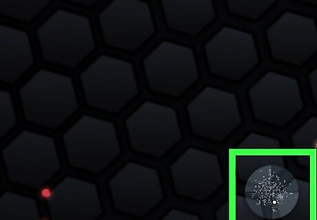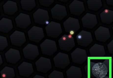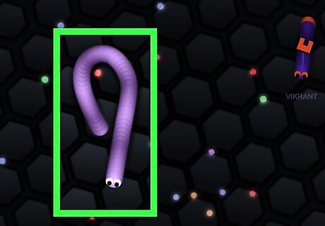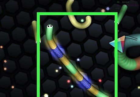 Stick to the edges of the arena, staying away from the middle. To start with, look at the map in the bottom right hand corner of the screen. You can see the map is circular and has many dots inside of it. The biggest white dot is you. The map is sectioned off into four quadrants, try moving your snake to the edge of a quadrant so you can be far away from other snakes.