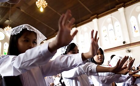 Participate as part of the group when the leader of the service asks the congregation to rise for prayer, singing, or other activities. Sing with the adults, if it is appropriate, but don't sing in too loud of voice if you are not familiar with the song, or you simply cannot carry a tune.