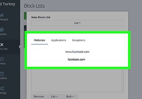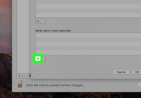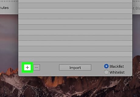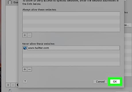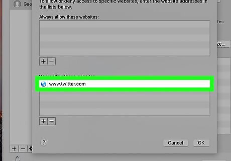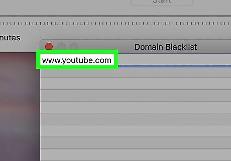 Type a web address at the top of the list and press Return. Use the bar that says "Type URL, then press the return key" to enter a website you want to block. For example, if you want to block Facebook, you would type www.facebook.com. Add as many websites as you want. To remove a website from the list, click the website, then click Remove.