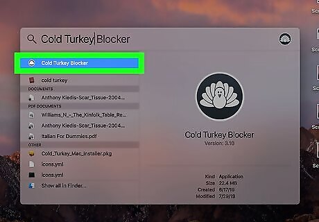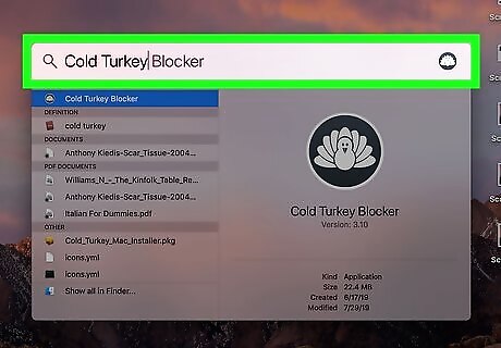 Click the Spotlight Mac Spotlight and type in "Cold Turkey". The spotlight search is in the upper-right corner of the menu bar. Once you type in the app name, a list of matching searches should show up below the search bar.