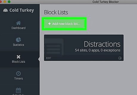 Click + Add a new block list. This creates a new list of blocked sites. Cold Turkey also has a pre-installed list called "Distractions" with 54 common sites already listed.