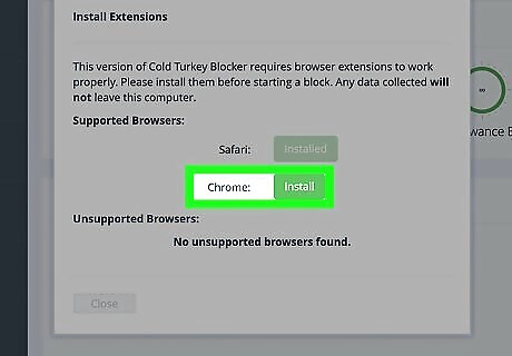 Add the extension to your web browser. The way this is done is slightly different from one web browser to the next. Use the following steps to add the Cold Turkey extension to your web browser. Safari: The Cold Turkey extension is added to Safari automatically. Chrome: Click Add to chrome in the pop-up at the top. Click Add extension. "Firefox:' Click Allow Click Add. Click Ok.