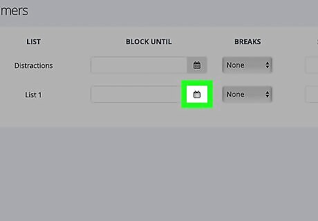Click the calendar icon next to a block list name. The Timers screen displays all block lists you have created. Click the icon that resembles a calendar next to the block list you want to use.