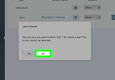 Click Yes. This confirms that you want to set a timer and blocks the websites in the block list for the set amount of time. WARNING: Once you set a timer, you cannot turn it off until the timer runs out.