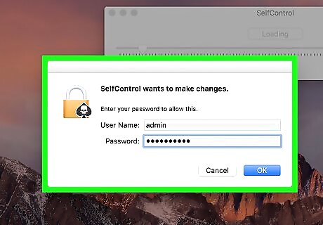 Type an administrators username and password. Type the username and password associated with an administrator account on your Mac. This gives SelfControl the authorization needed to work.