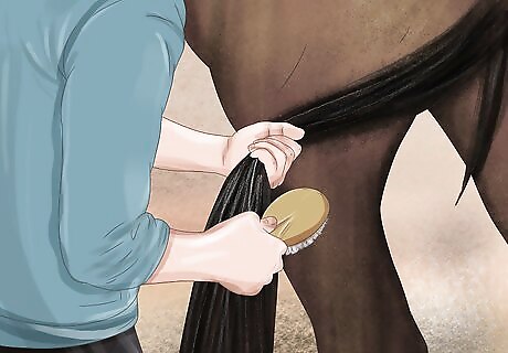 Use the dandy brush on the tail while standing to the side of the horse. Start at the bottom of the tail and work your way up to the top. Work on small sections at a time and run the soft bristle brush through the hair after you work out any knots with your fingers. Be careful when working behind the horse. Always stand off to the side to avoid being kicked if the horse gets scared or fidgets.