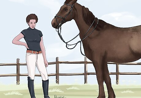 Wear stable-friendly clothing to protect your feet, legs, and head. Horses are large animals and sometimes aren’t aware of their own strength. When you’re first working with a new horse, wear a helmet to prevent accidents from kicking or bucking. In the stall, wear jeans and boots to protect your feet and legs from being stepped on or cut by sharp objects. You can wear a short-sleeved or long-sleeved shirt while grooming, but a long-sleeved shirt will provide more protection and keep you cleaner. Wearing gloves can protect you from painful hair splinters, but may make grooming more difficult because it's harder to move your hands.