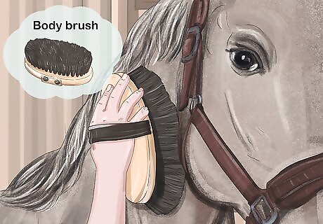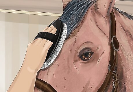 Brush the face using soft bristle brushes only. Grab your body or dandy brush to brush the facial area, using soft strokes and working slowly around the face. Avoid the eyes, and instead focus on the cheeks, ears, nose, and the top of the head. If the horse moves its head away from your touch, stop brushing for a few seconds before slowly re-approaching with your tools. Only work on the face after you’ve brushed the rest of the body to give the horse time to adjust to your touch. If you touch the eye with a bristle and the eye is injured, seek care from a veterinarian immediately.