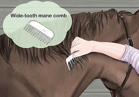 Groom the horse’s mane with a wide-tooth mane comb. The mane comb is made of plastic or metal and has one row of long, spread-out teeth. Start at the bottom of the mane and work your way up, gently running the comb through the hair. When you come across a smaller knot or tangle, use the comb to gently pick at it until it comes undone. Use a detangling spray to help loosen knots and prevent hair breakage. Products like Cowboy Magic are great for detangling manes and tails. Combs can break the hair more easily than brushes, but they’re better at removing tangles and knots. Be sure to work slowly to avoid breakage. Only comb the hair with a metal comb once per week to avoid excess breakage of the hair.