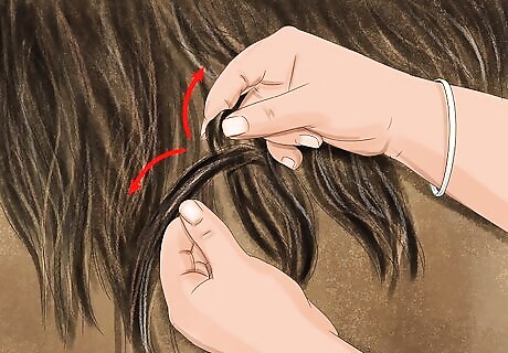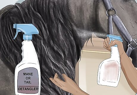 Separate any large tangles in the mane or tail with your fingers. If your horse has unruly hair, they will probably have visible knots. Use your fingers like a comb and carefully untangle the knots. Work slowly to avoid tugging or pulling on the hair, which can annoy the horse and cause it to start fidgeting. Be patient while working on tangles. Eventually, with some effort, it’ll come out. You should “finger comb” the hair daily to avoid the progression of major knots.