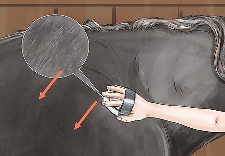 Brush in the direction of hair growth. Keep in mind that horse hair normally grows in the same general direction and pattern, like it does on a dog or cat. Brushing against the direction of growth can be uncomfortable and stressful for the horse. Keep an eye out for any spots in the horse’s coat where they might have some abnormal hair growth. For example, some horses will have hair that grows in a circular pattern on their stomachs or near their legs. Brushing with the hair and working in the direction of growth is also more effective for removing dirt.