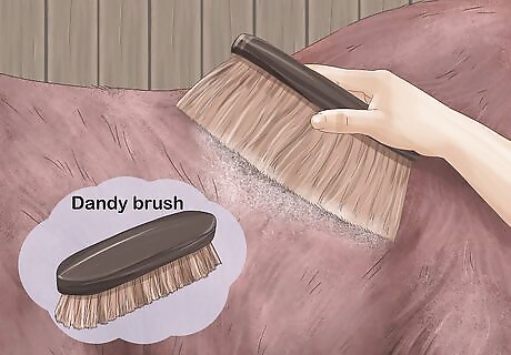 Wipe off excess dirt in the hair with a dandy brush. A dandy brush has pliable, short, synthetic bristles that will bend when you touch them, almost like a broom. Using a flicking motion, like you would with a broom, wipe the dirt from the hair. Work from the neck to the rear, using long, sweeping motions. You should see a little cloud of dust with each stroke of the brush. If you don’t, adjust your “flicking” motion so that you’re pushing the dirt out of the hair. You can use the dandy brush on various parts of the horse, including the neck, body, tail, and even the face.