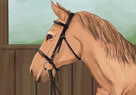 Secure your horse comfortably in the stall with a leather halter. Make sure the halter is properly attached to the horse and tied tightly to the stall by looping it around a hook or the stall door and tying a knot. The horse should still be able to move its head and body, but will be tethered to the stall. Alternatively, you can use “quick-release” snaps attached to cross-ties to make sure the horse stays in place but can break away if necessary. You can brush the horse outside of the stall as long as it’s comfortable and secured in one place. If the horse isn't secure, it can potentially run away in the middle of your grooming session. A good place to secure a horse outside of their stall is in the aisle or in a wash rack. Both areas have cross ties to keep your horse still.