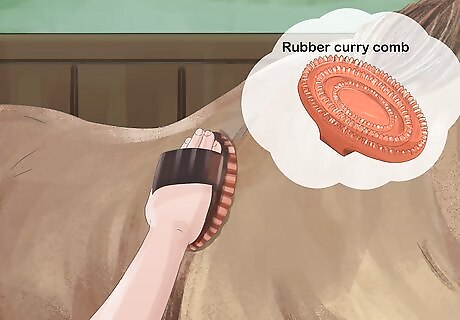 Use a rubber curry comb in circular motions to loosen dirt. A curry comb is an oval-shaped comb that has raised ridges that are made of stiff rubber to remove dirt and hair. Work your way from the neck down to the side of the horse and the rear, moving the curry in small circles to kick up dirt from under the hair. Once you finish one side, switch to the other and work from the neck to the rear again. Never use the curry comb on the horse’s face or bony parts of the body, like the legs. The stiff bristles can cause the horse to become uncomfortable and unruly. It’s safe to use the curry comb anywhere else on the horse! Be sure to pay special attention to the saddle area if you plan on riding. The curry comb will prevent matting and sores in that area.
