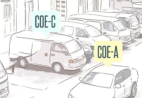 Know which COE Category you need. There are five different categories of COE: A, B, C, D, and E. Every bidding period will have a separate quota of COEs available for each category. Category A: Passenger vehicles with an engine capacity of 1600cc and below. Category B: Passenger vehicles with an engine capacity above 1600cc. Category C: Buses and vehicles transporting goods. Category D: Motorcycles. Category E: A special category that includes all the vehicle types described in Categories A-D. This category is usually the most expensive type. However, if you choose to register a motorcycle with a Category E COE, you will only need to pay one third of the quota premium.