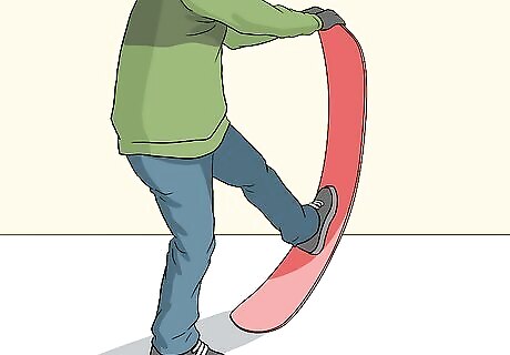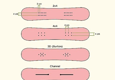 Choose your binding mounting. Some boards will have a particular layout of binding attachments for mounting the bindings to the board. In general most boards and bindings will be interchangeable but there are some that will not work together. There are four different types of mounting patterns: 2x4 disc pattern, 4x4 disc pattern, 3D pattern (Burton) and the channel system (Burton). The 2x4 disc pattern has two rows of holes 4 cm apart. In each row the holes are separated by 2 cm. this allows for many different options when mounting bindings. The 4x4 disc pattern has two rows of holes 4 cm apart and within each row the holes are separated by 4 cm. The 3D pattern has holes shaped in a kind of a diamond pattern which are compatible with most bindings but offer more limited options in terms of stance. This pattern is common for Burton boards. The channel system is a rail that allows the rider’s feet to have an extremely close connection to the board for a better feel on the board. These are common on Burton boards and it is best to use EST bindings by Burton. These bindings have many stance options. You can purchase a special plate to use non-Burton bindings on a board that uses the channel system.