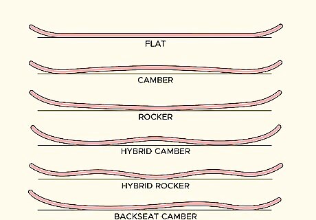 Decide on the arch of the board. A camber board is one that has an arch at the center with the nose and tail being the main contact points of the board with the ground. The other type, a rocker board, is the reverse of the camber. Traditional camber has been around since the beginning of snowboards and provide more pop for freestyle riders, more responsive edge changes for all mountain riders and a smoother ride through uneven terrain because it can flex more. They hold their shape and flex for locker than rocker boards. Rocker boards are liked by freestyle riders because they won’t catch edges on rails, by backcountry riders because they float over powder and by beginners because they make it easier to roll from edge to edge. Some boards will simply be flat, which is in between a camber and rocker board, providing better turning ability than a fully camber board and more precise edging capability than a fully rocker board. Different brands have different versions of camber and rocker boards so read the descriptions to see what that particular style was designed for. Some brands are now experimenting with mixing the rocker and camber arches together on boards. For example, a board might have rocker in the center and camber at the nose and tail or camber in the center and rocker in the nose and tail. These are designed for different purposes and have a wide range of opinions. There are no rules in terms of camber or rocker. Choose the version that works best for you.