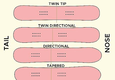 Determine the correct shape for your snowboard based on your style of riding. There are four types of shapes of snowboarding boards: twin, directional, twin directional and tapered. The shape descriptions are based on the length and width of the nose and tail. Twin boards are symmetrical on each end of the board, meaning that the nose and tail are the same length and width. They are designed for beginners and freestyle riders because they can be ridden in both directions, or regular and switch. These will also be good for kids. Directional boards are for one-way use with a longer and wider nose than tail, giving more suspension and performance in that direction. This type of board would be more useful for a freerider. Twin directional boards are a mix in terms of shape between twin boards and directional boards. They are designed for all mountain freestyle riders because they provide stability at higher speeds and for carving but also allow for switch riding and freestyle terrain use. Tapered boards are more extreme versions of a directional board. The nose will be much wider than the tail in order to give the board more float in powder. This type of board is designed for powder riding.