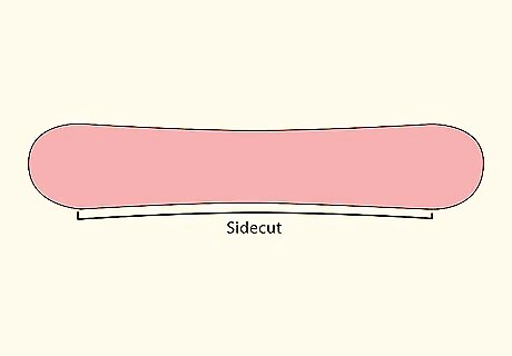 Pick the amount of side-cut you want in your new snowboard. This is the amount of curve in the board between the nose and the waist and differs by brand to brand. Side cut is measured in meters by the radius of the circle that would be created if it were continued all the way around. Freestyle riders and beginners may want to choose a board with a lower side cut measure (deeper curve), which affords greater ability to turn quickly. A larger side cut measurement smaller (more shallow) is best for longer, slower turns and provides more surface area on the ground, making it better for freeriders and powder riders. There are many new side cut technologies that offer bumps or areas in the side cut that offer additional contact points to grip better in the snow. These are good for icy hard-packed terrain.