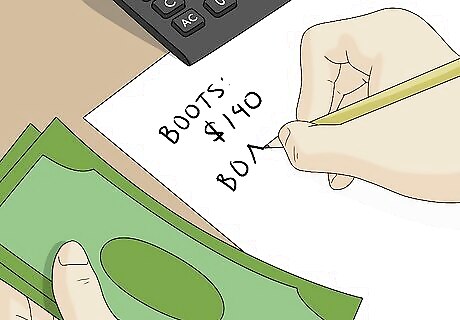 Budget for your snowboard. A snowboard plus boots and bindings will cost from $450-$1000 and up depending on the style, materials and design. The cost of your board will depend on your budget and ability level so it is a good idea to figure your budget out before heading to the store. Entry level boards will cost in the range of $150-$250, with boots costing around $140 and bindings costing around $150. Mid-range boards will cost between $250 and $450, with boots costing around $200 and bindings costing around $200. Top end boards will cost $450 and up, with boots costing $300 and up and bindings costing $250 and up. Kids boards can be purchased used to save on costs but the board should be good quality without nicks or damage.