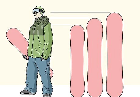 Determine your height and weight to find the appropriate length board. Boards are measured in length from tip to tail and this length has a big effect on performance. In general the height should be between your shoulder and nose when standing. There are a few characteristics that determine the exact length your board should be within this range. If you are a heavier person, you should choose a board that is a bit longer. If you are lighter then you should get a shorter board. If you are a freestyle rider, a beginner or a kid then you should choose a shorter board because they are easier to control, spin and turn. A shorter board would come up about to your Adam’s apple. If you are a free-rider or powder rider then you should choose a long board that comes about to between your chin or nose. Some might even choose longer boards. A longer board will give more stability at high speeds and more surface area on top of the powder. Shorter boards are better for kids because they are easier to control. However, kids are also always growing so it may help to choose a board that is a bit on the longer size for their height so that they can grow into it instead of growing out of it too quickly. For kids, choose a board that is closer to the chest for those who are beginners, are cautious, are lightweight and/or like to make short quick turns without riding fast. Kids who are riding fast and aggressively, weigh more for their height or are growing quickly should choose a board closer in length to their nose. Do not choose a board longer than this or it can hamper their learning and the amount of fun they have.