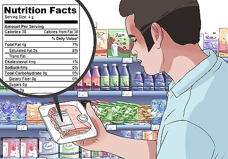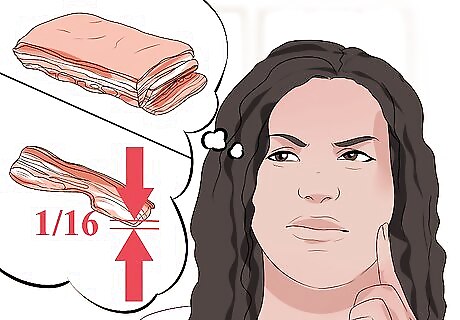 Choose a type of cut. The type of cut you want depends on what you plan to use the bacon for. The cut of bacon determines its thickness. Most bacon is standard cut, which comes in strips that are 1/16 of an inch. Thick cut bacon is slightly larger than the standard cut. The strips are generally twice as thick as standard bacon. Both of these can be used in typical breakfast foods, but thick-cut may be better as an addition to pastas and soups. Center-cut is cut close to the bone. It generally has about 30% less fat than other cuts. If you're looking to cut down on fat, go with a center cut. You can also buy a slab of bacon at the butcher's counter. This bacon is uncut, allowing you to determine thickness by yourself.
