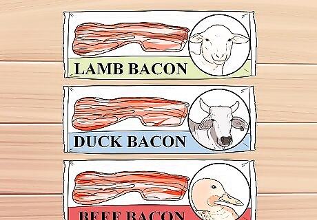 Try non-pork products. Bacon is usually made from a pig, but there are other varieties. Bacon can also be made from a duck, beef, and lamb. Duck bacon has less fat than regular bacon, so if you're health-conscious it may be a great choice. If you like duck meat, try duck bacon. Beef bacon is similar to pastrami. It tastes similar to regular bacon, but with a beefier taste. It also tends to be juicier. Lamb bacon has a rich flavor. If you enjoy dishes made from lamb, you may prefer lamb bacon.