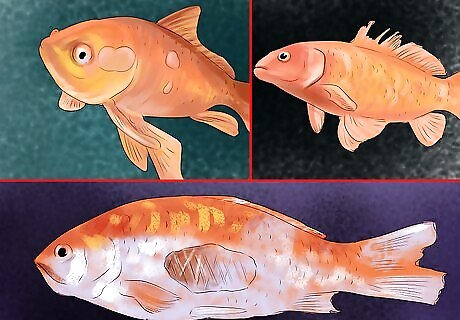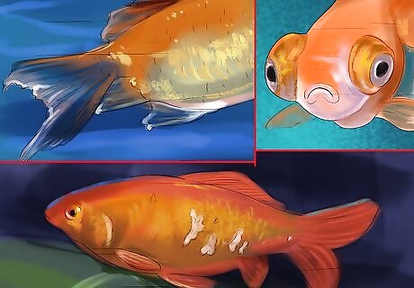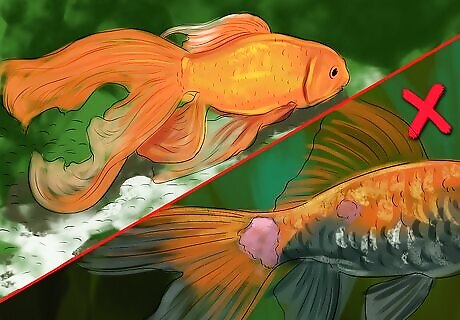Check the health of potential tank mates. Before you buy a tank mate and introduce it to your goldfish, it’s important to make sure the fish is healthy. This can prevent the introduction of illness and even death to your goldfish. Look for obvious signs of disease by examining the fish’s body and watching its behavior. Signs of physical disease include: white spots or velvety patches on the body, missing scales, incomplete fins, cloudy or bulging eyes, ulcers or other lesions, rapid breathing and shaking. Behavioral signs of disease may include: scraping against the tank, erratic swimming, listlessness, gasping at the surface, or sulking in a corner. Make sure you check the other fish in the tank as well. Even if your potential tank mate doesn’t show obvious signs of disease, other diseased fish in the tank could indicate a potential problem. In these cases, even a healthy-looking potential tank mate could introduce disease to your goldfish.