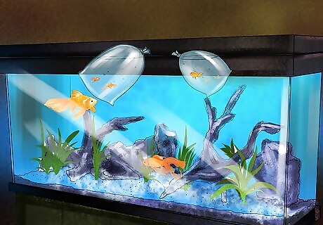 Acclimate the new fish to the water. Once you’ve ensured that your new fish is healthy and ready for its new tank, you’ll need to acclimate it to the new tank water. This can help ensure a smooth transition for your new fish and the goldfish or any other fish you have in the tank. Float a sealed bag in your tank. Allow it to sit for 15 minutes before opening it so that the temperature in the bag adjusts gradually. Then cut open the bag and allow your new fish to swim free.