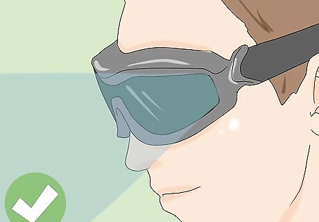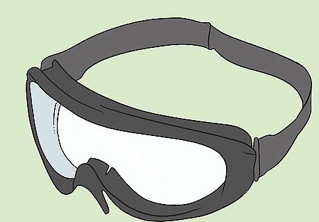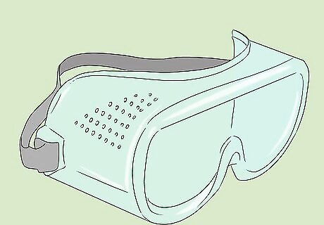 Select safety spectacles for impact protection. Safety spectacles feature impact-resistant lenses that prevent projectile debris and particles from damaging the eyes. Choose a pair with detachable or built-in side shields to provide protection around the sides of your eyes. If you’d like extra security on your face, choose safety spectacles with an elasticated head strap. For safety spectacles that fit like regular eyeglasses, choose spatula temples that will sit around your ears. Purchase a pair with Plano lenses if you don’t need vision correction. Order a pair with corrective lenses suited to your vision prescription. For added comfort, choose a pair with adjustable nose pads. While safety spectacles can be made from different materials, select polycarbonate lenses if you need the highest level of protection. Choose safety spectacles if you’ll be exposed to flying particles and chips, but not splashes or airborne irritants. For example, if you’re chopping bricks with a hammer and chisel, safety spectacles would protect your eyes sufficiently. But if you use an automated saw, wear safety goggles for protection against the fine dust the saw will generate.
