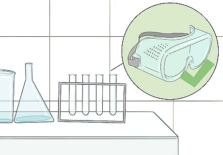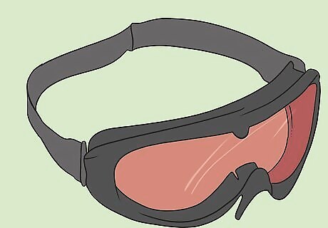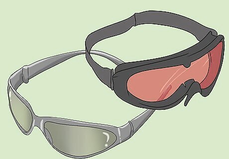 Purchase safety glasses that protect against the hazards you’ll be exposed to. The protective abilities of safety eyewear will differ based on application. While lightweight plastic safety spectacles can be purchased inexpensively at hardware stores, many work applications require a highly specialized type of safety glasses. These can typically be ordered online through the manufacturer or an industry retailer, but some employers process PPE orders for their employees. Welders should wear full welding shields that protect the skin from sparks and contain filtered lenses to protect eyes from intense radiant light. Technicians working with lasers will need filtered laser safety goggles to protect from beams. Chemists likely need safety goggles that fit snugly against your face and can be secured with a strap. This style provides complete protection from spilled or splashed liquids that may be hazardous. Athletes should look for impact-resistant safety eyewear that can be secured tightly with a strap. They should also look for anti-fog or ventilation features to combat sweat.