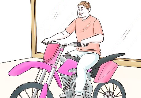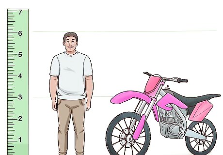 Take your height into account when choosing a dirt bike. Height is an important aspect when choosing your dirt bike. If you're too big for the bike, you'll be cramped when riding it and more likely to have an accident. If you're too small, you won't have as much control, and you will be more likely to have an accident. Generally, the dirt bike seat should be half your height. If you're 6 feet (1.8 m), the seat should be 3 feet (0.91 m) tall. When you sit on the bike, you should only be able to touch the floor with your toes and the balls of your feet. You should not be able to plant your heel. If you sit on a bike and can only touch the floor with your toes and the balls of your feet, the bike is the right size.